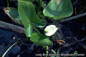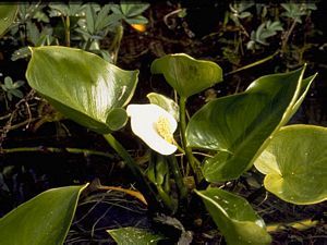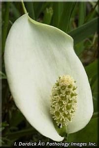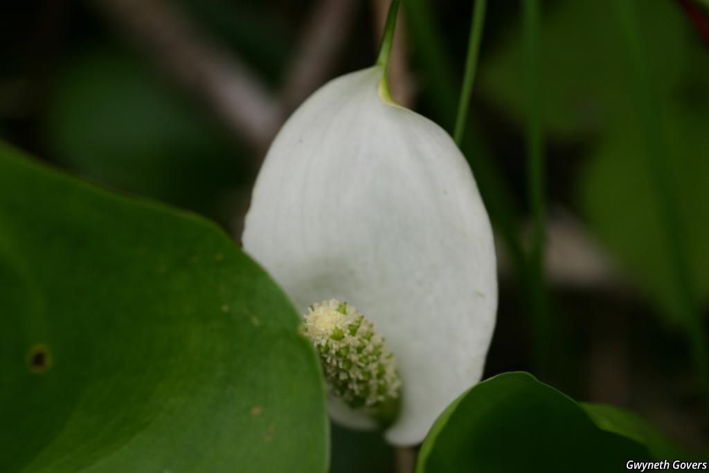 Flower spadix in white hood; rich soil.