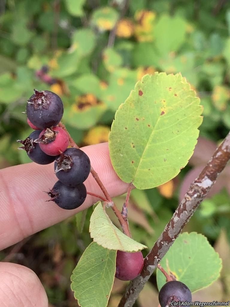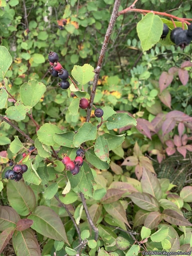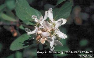 Traditional Edible, Medicinal Uses: The berries of this species are often considered the most flavorful for eating. About the size of a blueberry the saskatoon berry is popular as an edible berry, and is a more common shrub in the western provinces. (Plants for a Future) The fruit tastes like a blueberry with raspberry together with a bit of apple. (Evergreen) Rich in iron and copper, it can be dried and was made into pemmican. Medicinally used by North American First Nations, but little used in modern herbalism. Infusion of Inner bark used for snow blindness. Decoction of fruit midly laxative. Used for stomach upset, appetite restorer, ear and eye drops. Root decoction to treat colds. Use to stabilize frequent menstruation. Stem decoction, combined with snowberry is diaphoretic, and sweat inducer, and for lung and chest infections. A decoction with bitter cherry (P. emarginata) used as contraceptive, and other recipes for contraceptives involving this plant were used. Was also said to clean out and help heal women after birth, stop menstural periods after the birth, thus acting as birth control. (Plants for a Future)