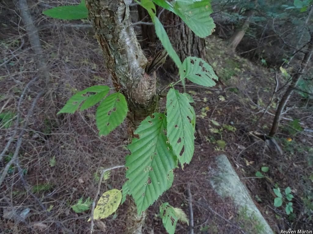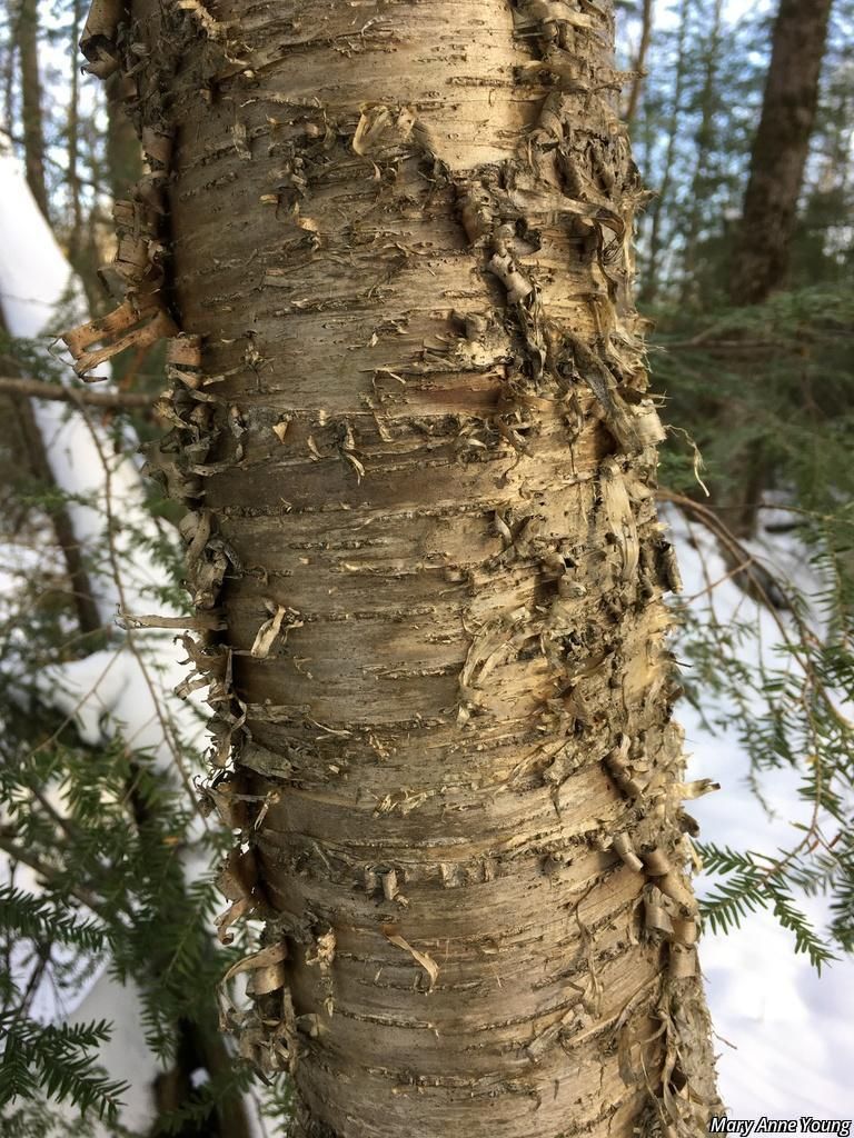 This is the largest of the native birches. (Hosie) Never tear bark from living trees; you could scar or even kill the tree. (Kershaw) Crushed foliage and twigs give off an odor of wintergreen. The bark is golden-yellow streaked with grey and brown. (Wild Flower Centre) Inner bark - cooked or dried and ground into a powder and used with cereals in making bread. The sap is harvested in early spring, before the leaves unfurl, by tapping the trunk. It flows abundantly, but the sugar content is much lower than maple sap. The twigs and leaves have the flavour of wintergreen and can be used as condiments. The bark is waterproof and has been used by first nations as the outer skin of canoes, as roofing material on dwellings and to make containers such as buckets, baskets and dishes. (Plants for a Future) The bark is yellowish, shining gray with a thin peeling quality. The leaves change from dark green to brilliant yellow in autumn. Moose, deer and hare forage on leaves and twigs in summer and winter.(Benvie) Insect Relationships: Besides the larvae listed above, the Brown-Shaded Carpet Moth also leaves its larvae. Many aphids, leafhoppers, stink bugs, a number of wood-boring beetles and the larvae of several Birch Sawfly take advantage of this tree's benefits. Mammal Relationships: Because of its thin bark, the Yellow-Bellied Sapsucker drills holes and feeds on the sap. The seeds, catkins, and buds are eaten by such birds as Ruffed Grouse, Common Redpoll, Black-Capped Chickadee, Purple Finch, White-Winged Crossbill and the Slate-Coloured Junco. Among mammals, the Red Squirrels feed on the seeds; the White-Tailed Deer and Cottontail Rabbit browse on seedlings and saplings and the Beaver gnaws on the bark and wood. Some vertebrate animals use birches as a source of cover and reproductive habitat. For example, such species as the Red Bat(Lasiurus borealis), Hoary Bat(Lasiurus cinereus) and Silver-Haired Bat(Lasionycteris noctivagans) use trees for summer roosting sites, maternity colonies, and hibernation. (Illinois Wildflowers)