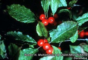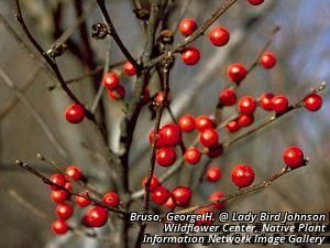Ilex berries and leaves contain an array of potential toxins which can cause moderate to severe nausea, vomiting, diarrhea, and rarely narcosis. Poisonous substance is theobromine. Death is unlikely. Observe carefully cases of where more than 2-3 berries have been ingested. (Ferris, H.) Sensory Aspect: Grayish bark and smooth twigs The purplish-green foliage turns black, in fact, with the first frost.(Lady Bird Johnson, 2005) This species is deer resistant. (Evergreen) Male and female flowers born on separate plants, therefore both must be planted near each other for pollination and fruit set to occur... The wooly bear caterpillar feeds on winterberry leaves. (John Kadel Boring) Ilex verticillata, winterberry, is often a marker of Fraxinus nigra, black ash, habitat. (Beresford-Kroeger, D.)