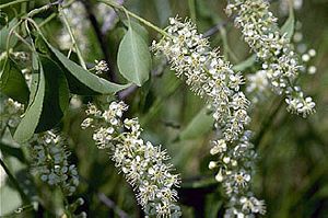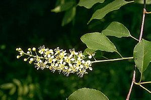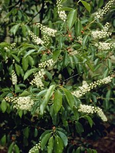 Serotina means late and this tree flowers later than other native cherries. (Trees, Shrubs and Woody Vines of N.C.) POISONOUS PARTS: Wilted leaves, twigs (stems), seeds. HIGHLY TOXIC. MAY BE FATAL IF EATEN. Symptoms include gasping, weakness, excitement, pupil dilation, spasms, convulsions, coma, respiratory failure. Toxic Principle: Cyanogenic glycoside, amygdalin. (Poisonous Plants of N.C.) Wild black cherry fruits can be eaten raw or used in jelly, syrup, wine, juice and pies (IF SEEDS AND PITS ARE DISCARDED). The leaves and inner bark were once used in tonics, sedatives and cough syrups. (Kershaw) This tree has been brought to British Columbia, although it is not native. (NatureServe) Seeds can be sown in the fall, or greenwood cuttings taken for propagation. Bird and Mammal Relationships: The fruit is eaten by many upland gamebirds and songbirds. It is also eaten by black bear, gray fox, red fox, eastern chipmunk, tree squirrels, opossum, raccoon and white footed mouse. Whitetail deer browse on the leaves and twigs. (Illinois Wildflowers)